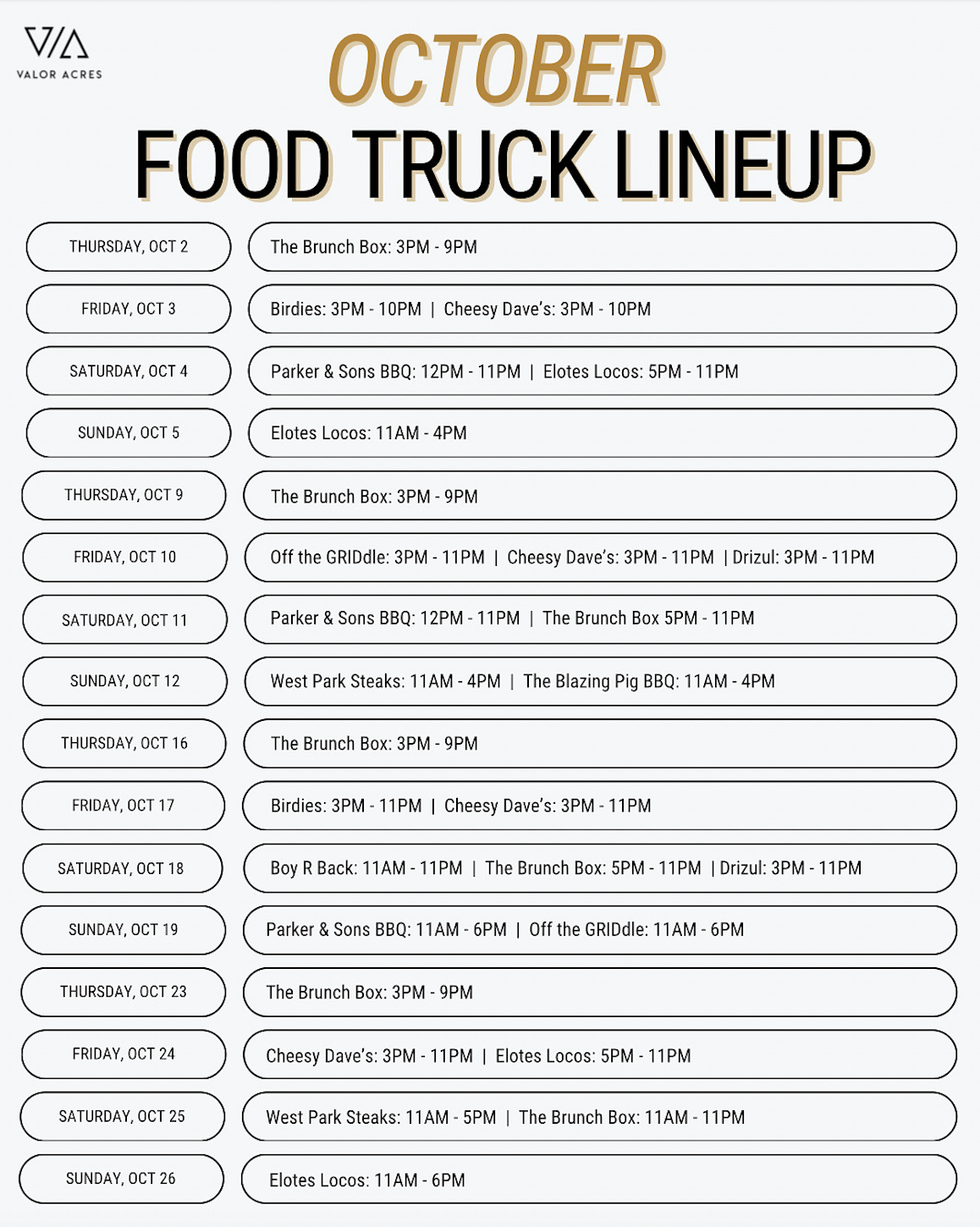 The Post includes both indoor and covered space that can accommodate 100+ guests, and the outdoor area surrounding The Post can accommodate approximately 500 guests, making it an ideal venue for both casual meetups and larger community events. If you’re interested in hosting a private event with us, please email us at privateevents@valoracres.com.